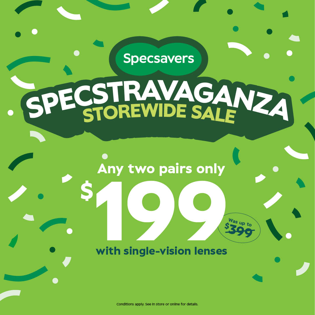 It’s the Specsavers Storewide Specstravaganza! Get any two pairs with single-vision lenses for just $199, that’s a saving of up to $200. Choose from designer brands like Country Road, DKNY, Tommy Hilfiger, Mimco and more. Offer ends 30 May. Conditions apply.